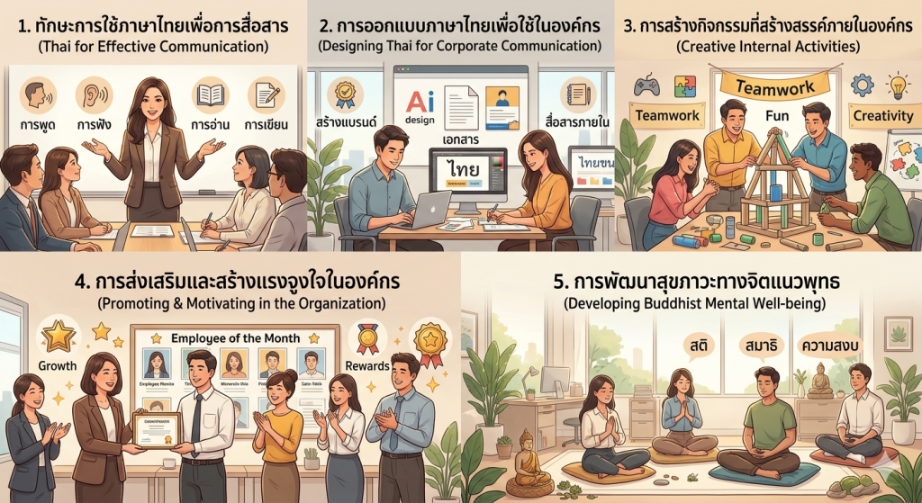 คอร์ส “การเสริมสร้างแรงจูงใจในองค์กรด้วยการใช้ภาษา” มุ่งพัฒนาทักษะการใช้ภาษาเชิงบวกและเชิงสร้างสรรค์ เพื่อสนับสนุนการบริหารจัดการคน การทำงานเป็นทีม และการพัฒนาองค์กรอย่างยั่งยืน ผู้เรียนจะได้เรียนรู้การใช้ภาษาเพื่อสร้างพลังใจ ลดความขัดแย้ง และส่งเสริมบรรยากาศการทำงานที่ดี